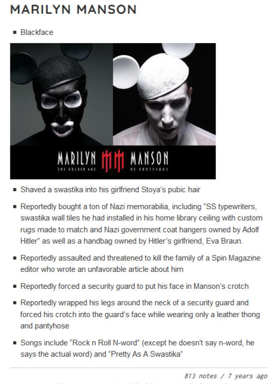 Manson also did full blackface in concerts for many years and said racial slurs about minorities (said the n word) constantly in his career